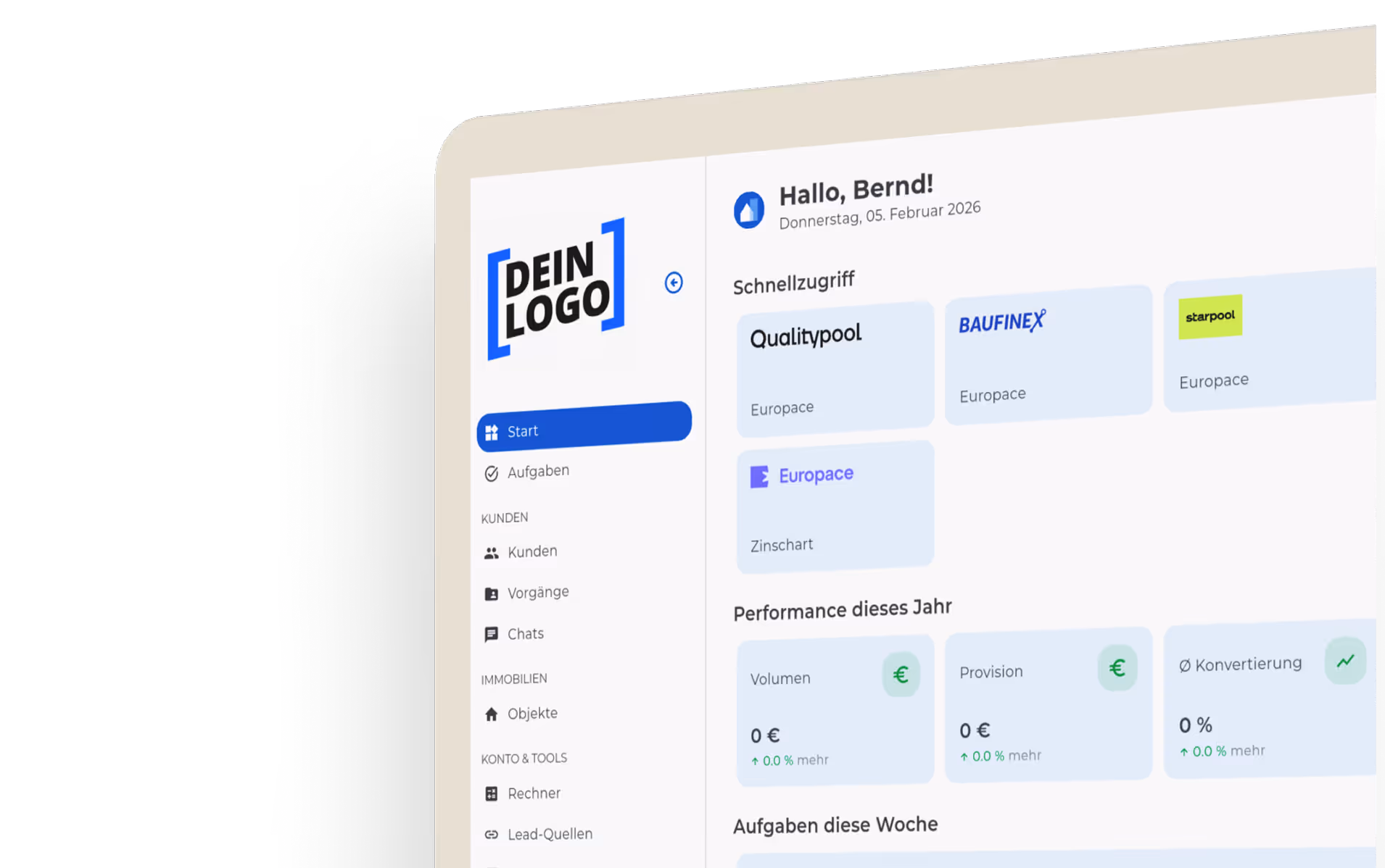 White-Label-Baufi-CRM für Großvertriebe, Pools und Banken – komplett im Look & Feel der eigenen Marke. Dein Logo, deine Farben, deine Prozesse. Für Berater, Kunden und Admins ein einheitliches, professionelles Markenerlebnis.